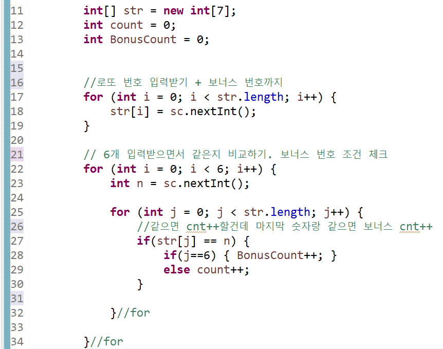 2. 이중 for문으로- 6개 입력받으면서 저장해놓은 7개 숫자와 비교해보자 생각