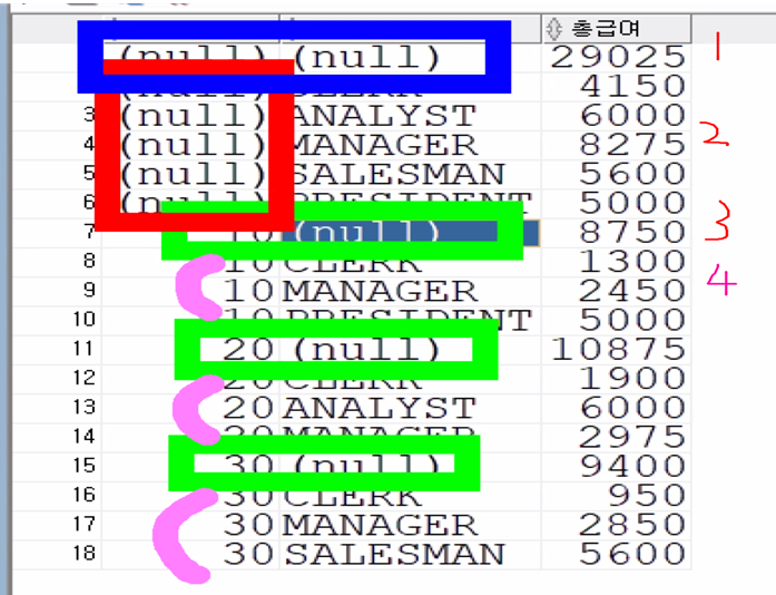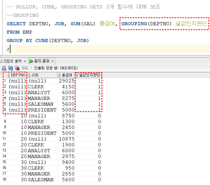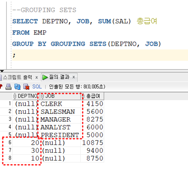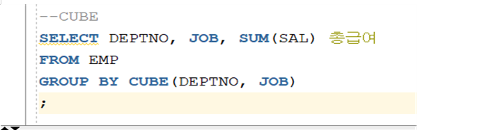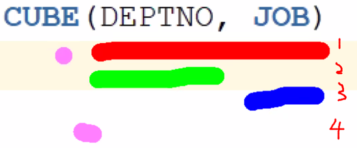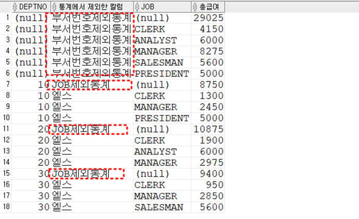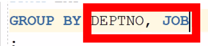 # GROUP BY로 했을 때는 ( DEPTNO, JON ) 2개 세트인 - 1개 그룹