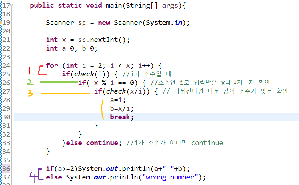 - 2. i가 소수가 맞다면 ( x % i )로 나머지가 0이 되는 숫자인지 파악하기 ( 2차 조건 ) - 입력된 수의 약수임을 확정