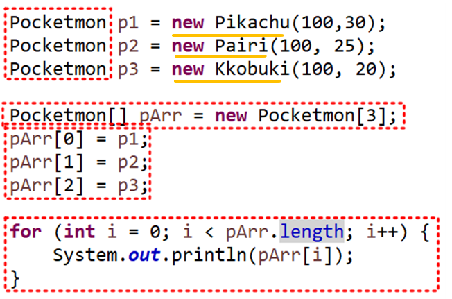 - 자식에게만 있는 메서드는 사용불가능하다 – 담아놓은 변수의 타입이 Pocketmon이라서
