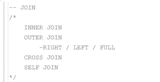 조인의 대분류 EQUI JOIN ( 10=10처럼 값이 같은지 비교하겠다. ) NON-EQUI JOIN (조건에 맞게 ~ ) 우리는 EQUI JOIN만 실습 1. INNER JOIN 2. OUTER JOIN -- LEFT OUTER JOIN -- RIGHT OUTER JOIN -- FULL OUTER..
