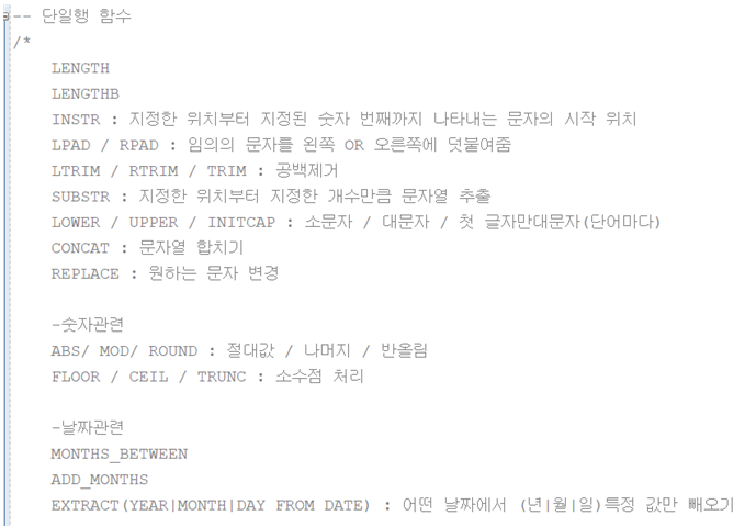 | SELECT | WHERE | ORDER BY | 단일행 함수 |
