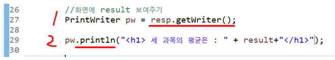 - resp.getWriter() 메서드로 PrintWriter 객체를 생 성해준 뒤