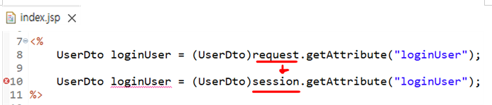 UserLoginServlet은 class파일이라서 session을 직접 만들어 주어야 하고,,