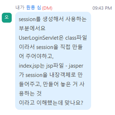 - jsp가 미리 만들어 둔 - request 객체 사용했듯이 session 객체 사용하면 됨.