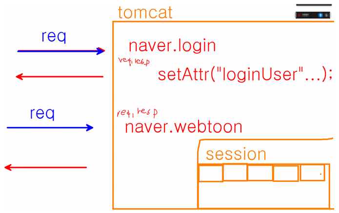 - session은 tomcat안에 이미 존재하고 어느 영역을 차지하고 있다.