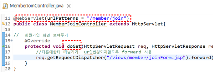- 파일 경로를 숨기기 위한 단순한 화면 파일 요청은 doGet() 방식으로 jsp파일 연결해주어서 처리