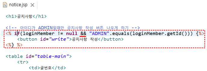 - 관리자 회원으로 로그인한 경우에만 "공지사항 작성" 버튼이 보이게 해 주기