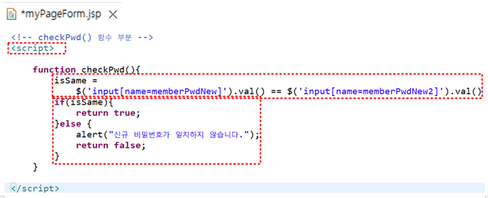 - 첫 번째 input 태그의 .val() 값과 vs 두 번째 input 태그의 .val() 값을 비교해서 - return