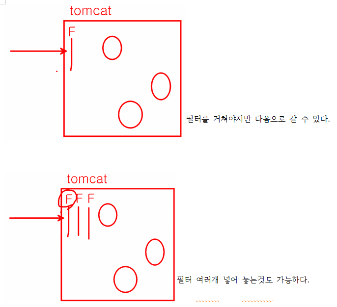 - 정확히 말하면 입구 = 특정 urlPattern에 대해서 무조건 거쳐가야 하는 서블릿이 필터!
