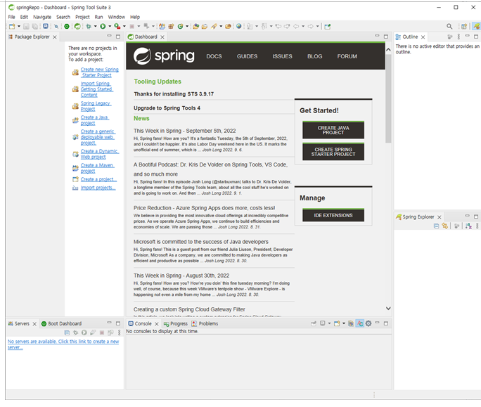 - sts란 – eclipse를 받을 건데 plugin이 설치 완료된 것을 받는 것이다.