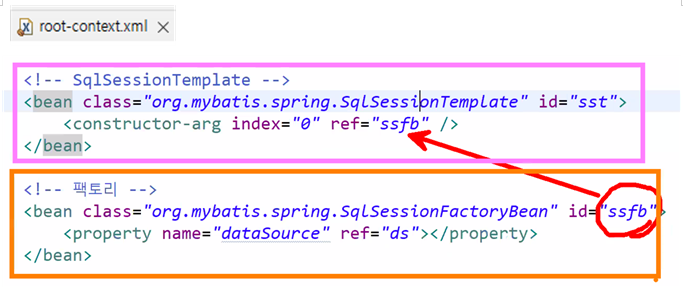 - - SqlSessionTemplate, SqlSessionFacyoryBean 객체 사용하겠다고 <bean> 등록