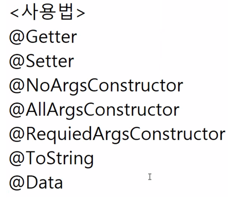 - 필드 추가할 때 자동으로 getter/setter /투스트링 만들어주는 애