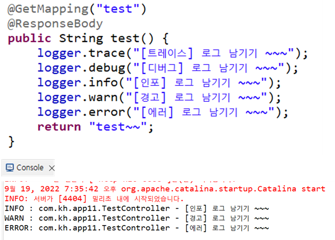 - 로거를 사용할 때 어떤 클래스를 기반으로 로거를 얻어왔고, 그 로거 객체를 이용하여 출력하고 있다.