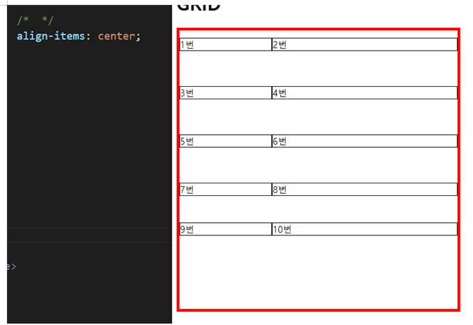 - 즉, 바깥쪽 요소에 grid해주면 – 요소의 수나 지정된 크기에 맞춰 나눠서 칸을 나눠주고 - 할당된 칸 만큼 꽉채워서 안쪽요소가 자리잡게된다. (꽉찬이유는 – align-items: stretch;로 기본 설정되어있어서 )