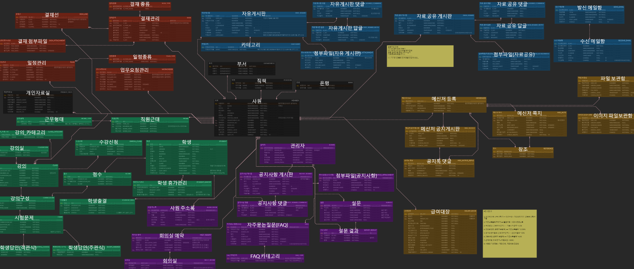 - 주요 기능 도메인별 도출 : 직원/학생관리 , 급여관리, 사내 커뮤니케이션, 업무, 관리자, 마이페이지, 로그인, 메신저