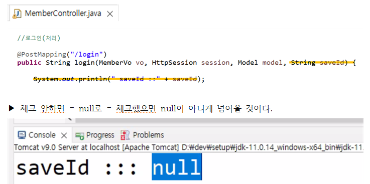 - 아이디 저장 박스 체크하고 보내면 – saveId라는 값이 넘어올 것이고 안 하면 안 나올 것이다.