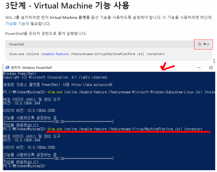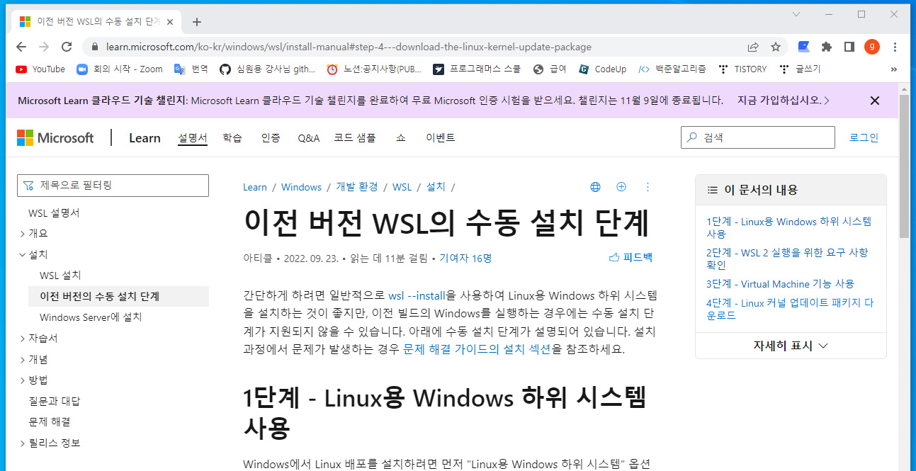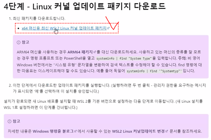 이런 페이지가 나오는데 여기서 단계별로 명령어 입력해서 WSL 설치하기 진행