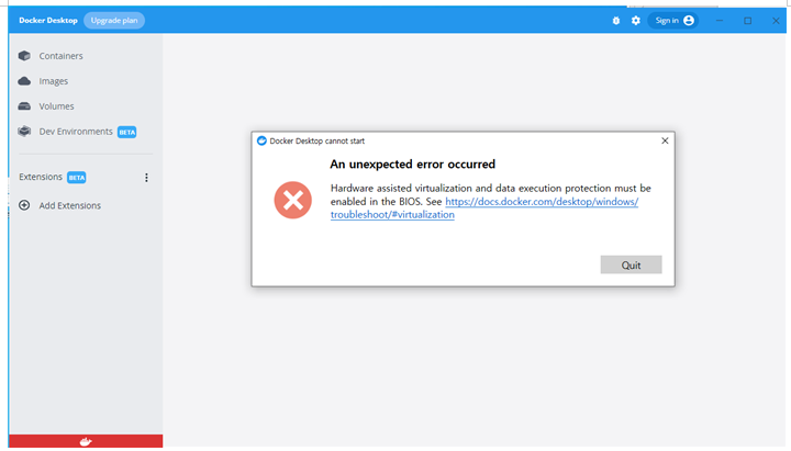 BIOS 가상화 설정 관련 에러가 나왔다.