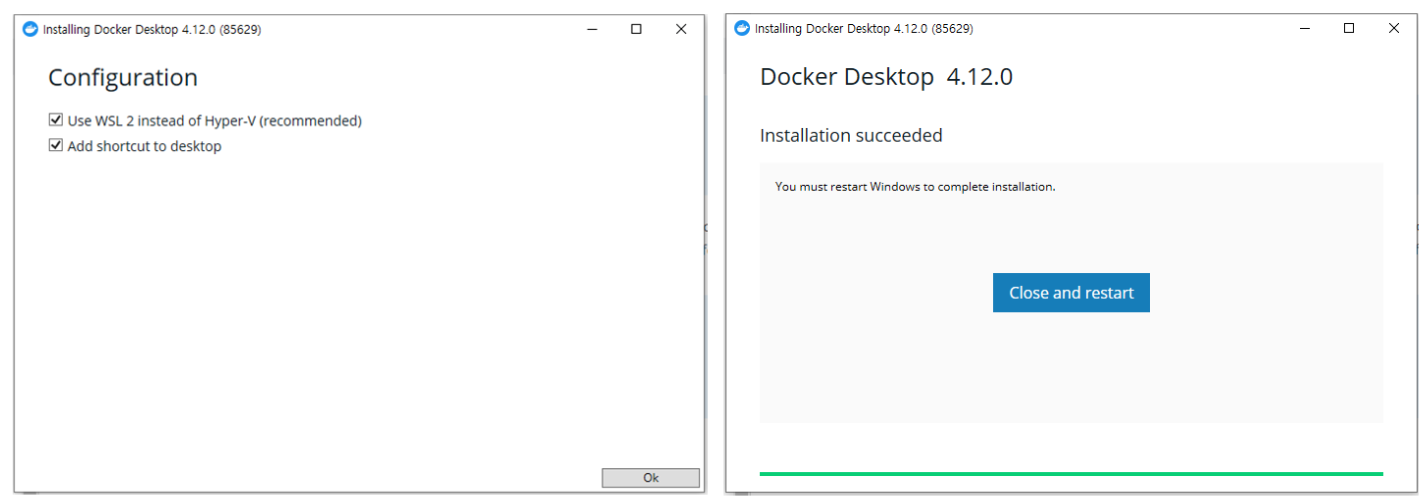 4. 설치 완료 후 돌아와서 Restart - 하지 말고 재부팅 후 다시 도커 실행!