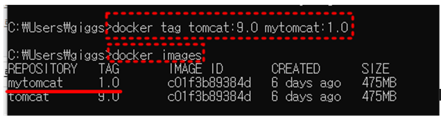 - docker tag <기존이미지명> <새로운이미지명>