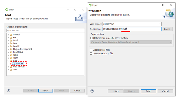 - 웹 개발에서는 – war 파일로 해주어야 한다.