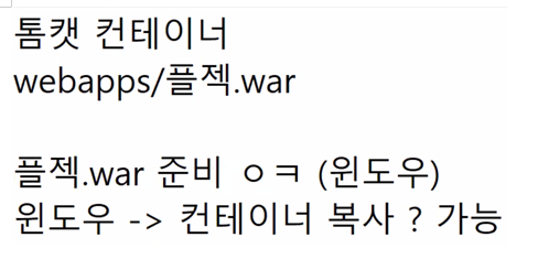 = ( 도커 컨테이너에 tomcat을 설치하고 - webapps 찾아가서 배포할 war파일 복사해주는 작업 )