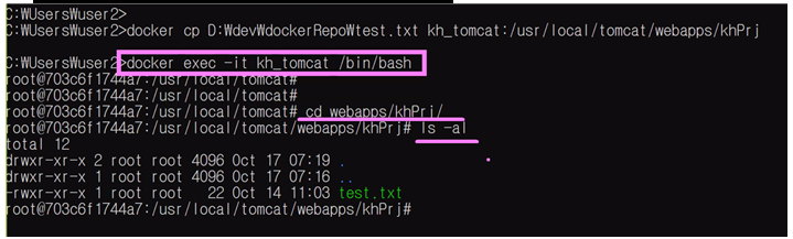 - 7-2 : docker cp <타겟파일경로> <복사할경로>