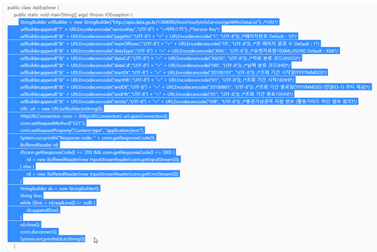 샘플코드 StringBuilder.append() URL HttpURLConnection BufferedReader |