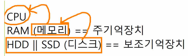 2-4 : hdd||ssd 에 있는 데이터 중 - 필요한 데이터들 ram에 올려놓고 - cpu에서 바로 사용