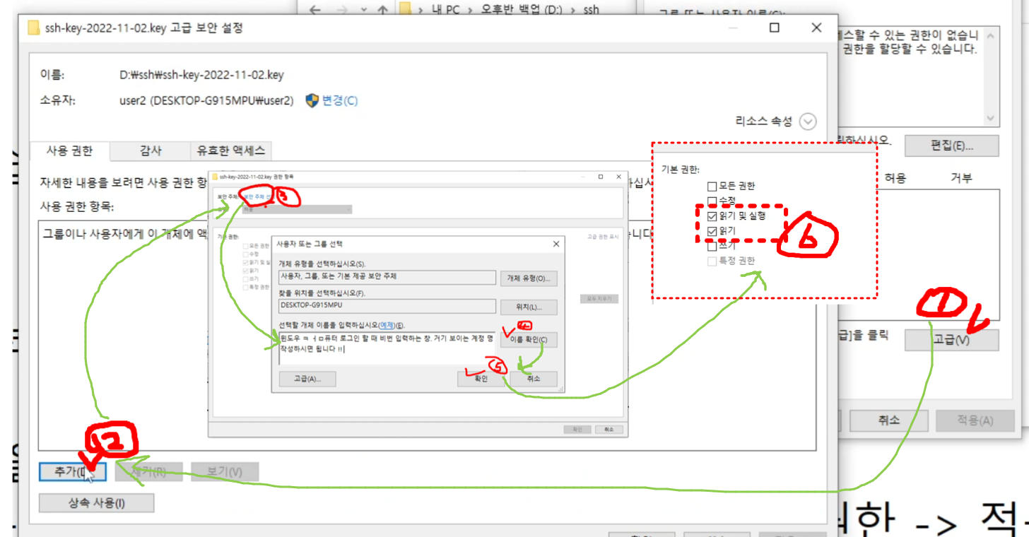 ssh -i 키파일경로 사용자명@ip주소 접속 권한 설정 해주기 |