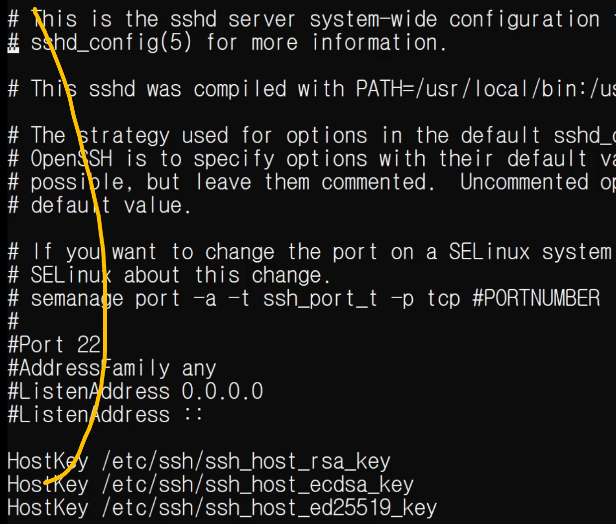 - /etc/ssh/sshd_config 는 이 파일을 메모장으로 실행하겠다. 이런 명령어