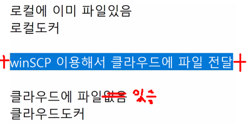 - 클라우드 컴퓨터에는 배포하고자 하는 war파일이 없어서 클라우드 도커에 copy가 불가능한 상황