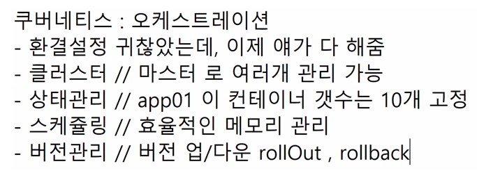 VM -> Docker : k8s | 환경설정 // 클러스터 상태관리 // 스케줄링 버전관리 |