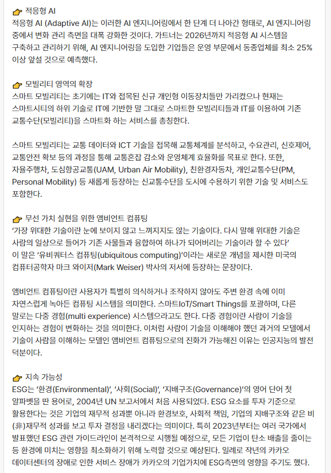 - 생성형 AI 와 적응형 AI - 요즘 AI를 빼놓고는 IT 트렌드를 말하기 어렵다. 개발 업무 관련 AI뿐만이 아니라 모빌리티에서 접목되어서 자율 주행, 드론을 이용한 택배 배송을 이용할 날도 가까워지고 있다는 것을 느끼고, 하루빨리 사용해보고 싶어 진다.